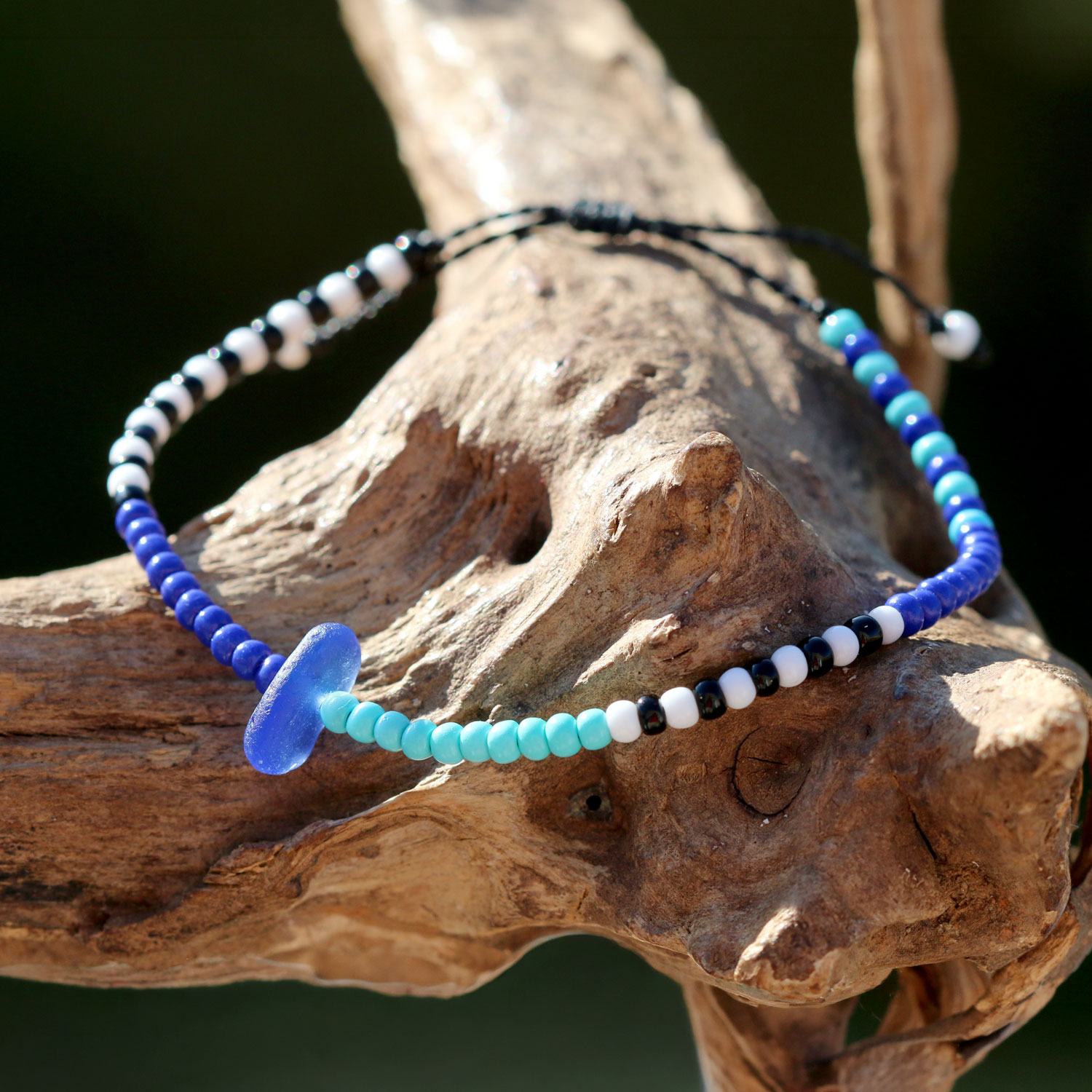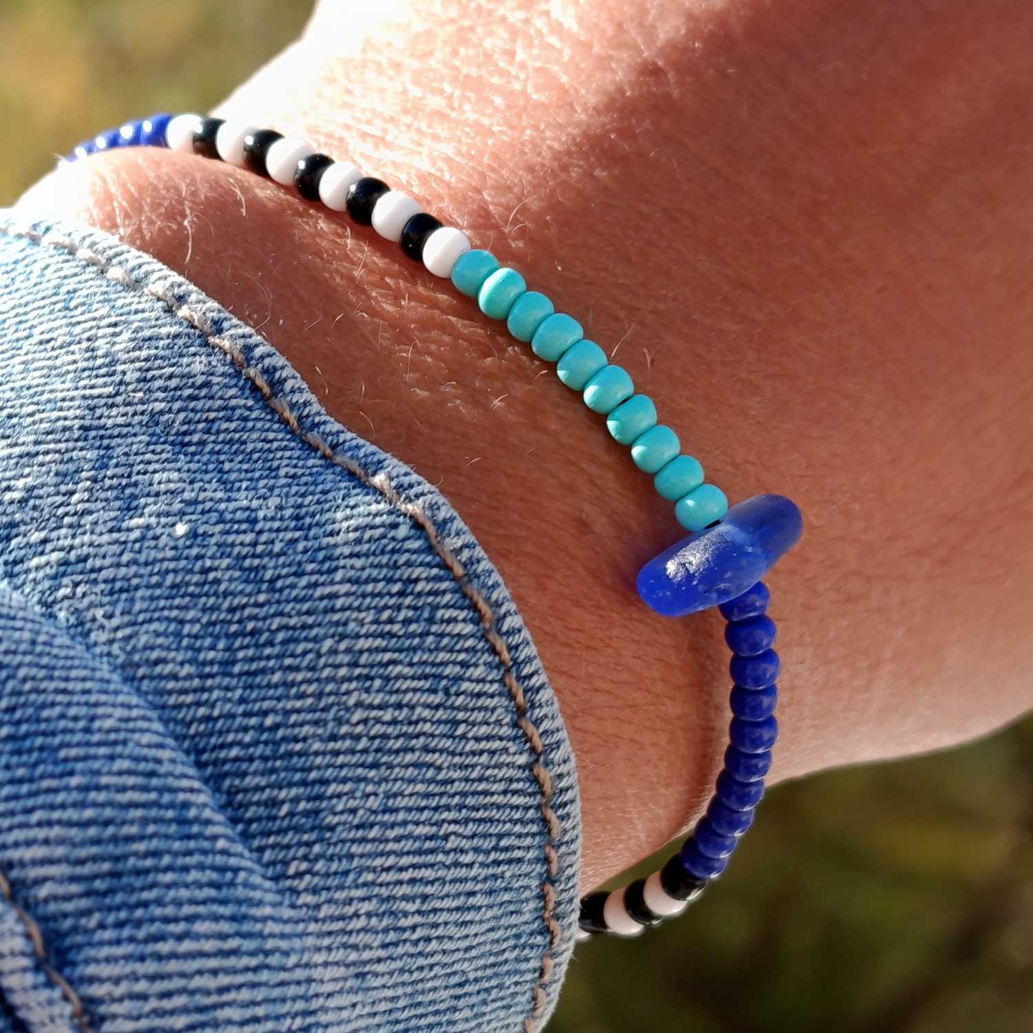 Meerfarbig – Armbändchen mit Perle aus echtem Seeglas / Strandscherbe vom Strand Marokkos und Rocailles. Die kleinen bunten Glasperlen haben einen Durchmesser von 3 mm. Das Armbändchen ist in der Größe einstellbar. Die Seeglasscherbe sitzt absichtlich nicht mittig sondern vorne seitlich, siehe Foto.