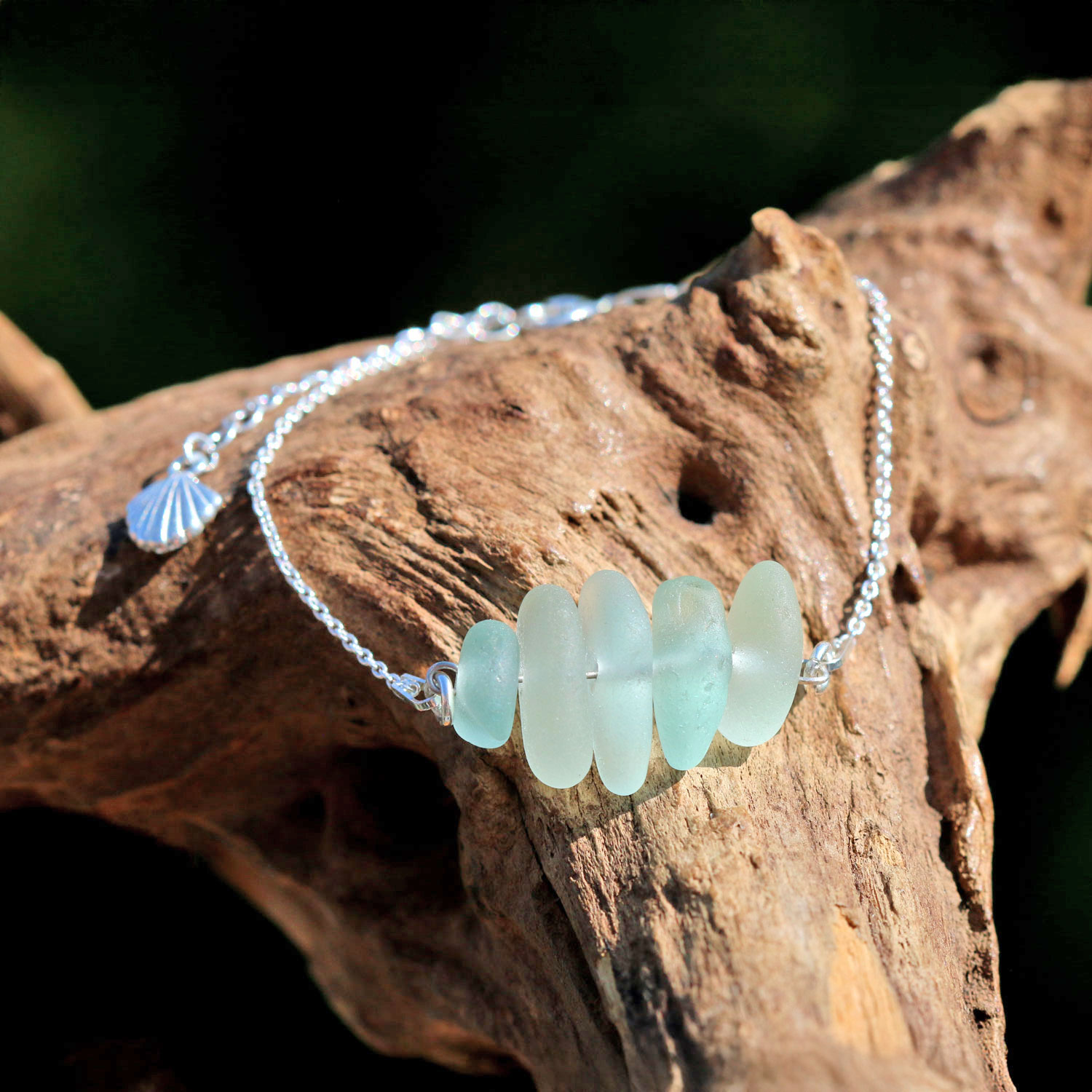 Vom Strand zum Armband… Armbändchen aus 925 Sterling Silber mit Perlen aus Seeglas / Strandglas ( Strandscherben). Das sehr zarte Armband hat eine Länge von ca. 15,5 cm zzgl. 4 cm Verlängerungskette mit Muschel. Es wird mit Karabiner geschlossen. Die Perlen haben eine Breite von ca. 2,3 cm. Alle Metallteile sind aus 925 Sterling Silber.