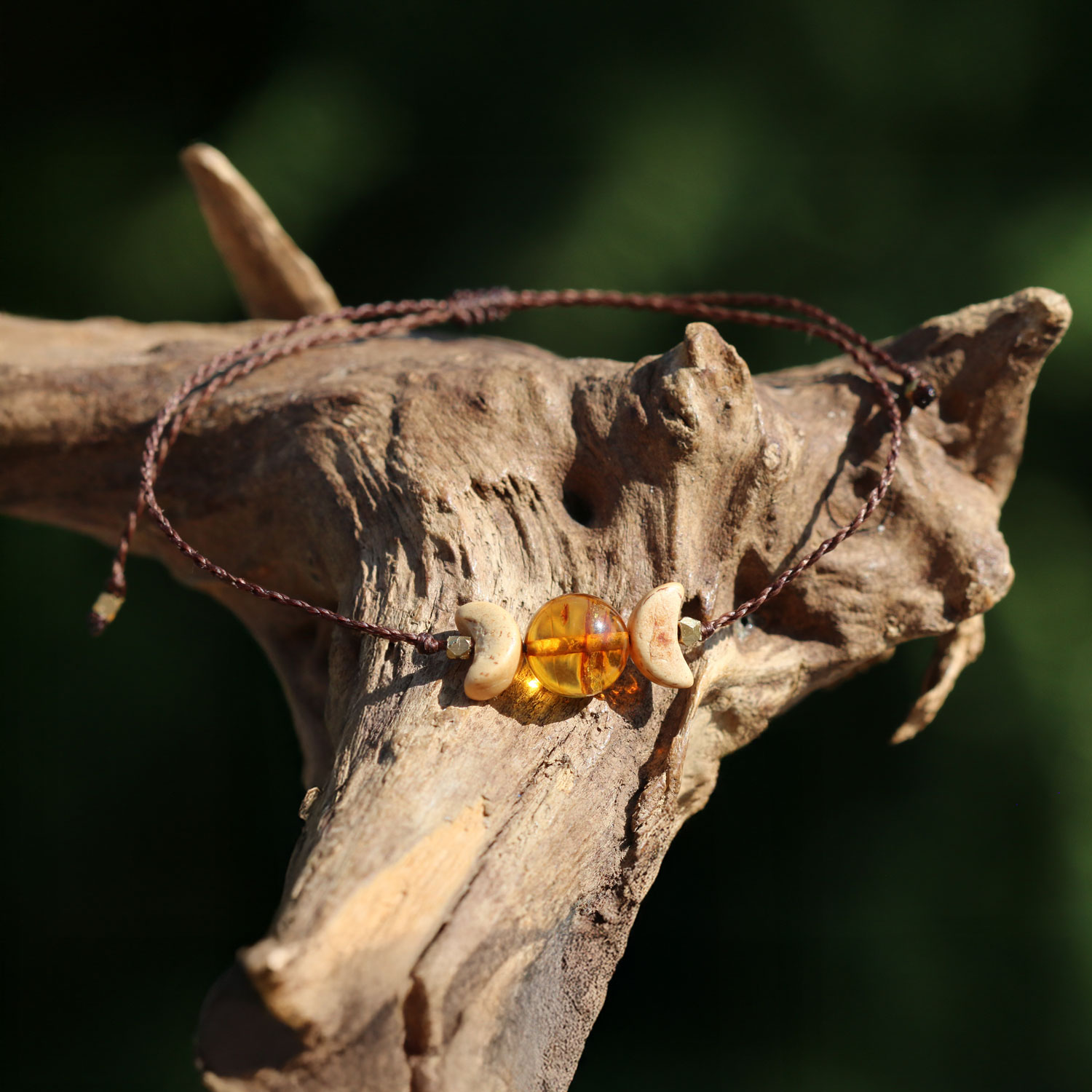 Sehr Fußbändchen mit Perle aus baltischem Bernstein, Halbmonde aus Kokosnussund Messingperlen. Das Fußbaendchen ist in der Größe einstellbar. Die Perle aus Bernstein hat einen Durchmesser von ca. 10 mm, das sehr zarte Band hat eine Stärke von ca. 1 mm.