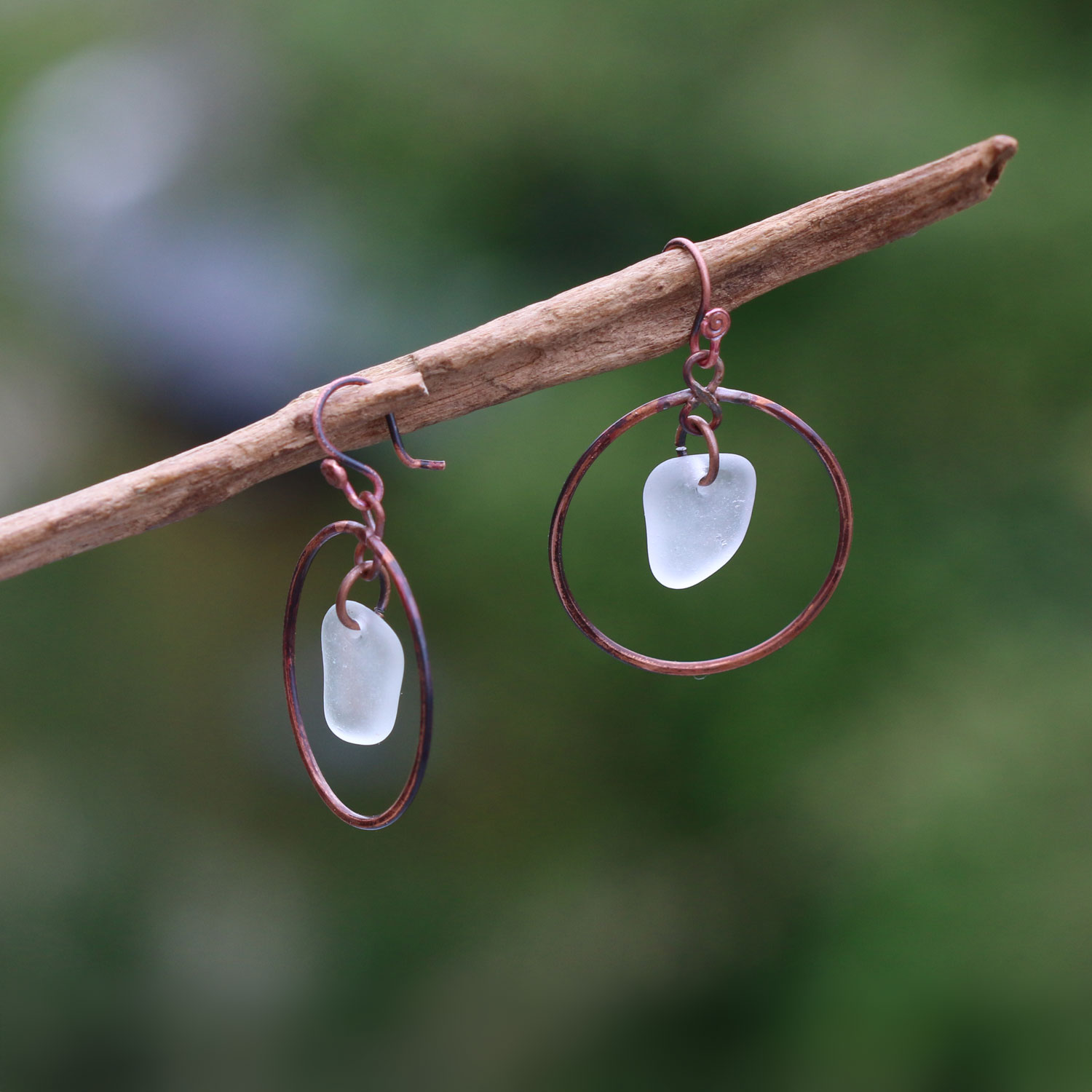 Vom Strand zu Creolen Anmut – Geschmiedete Creolen aus echtem Kupfer mit Strandglas (Strandscherben) aus Italien. Die Kreise haben einen Durchmesser von 3 cm. Schmuck mit Seele.