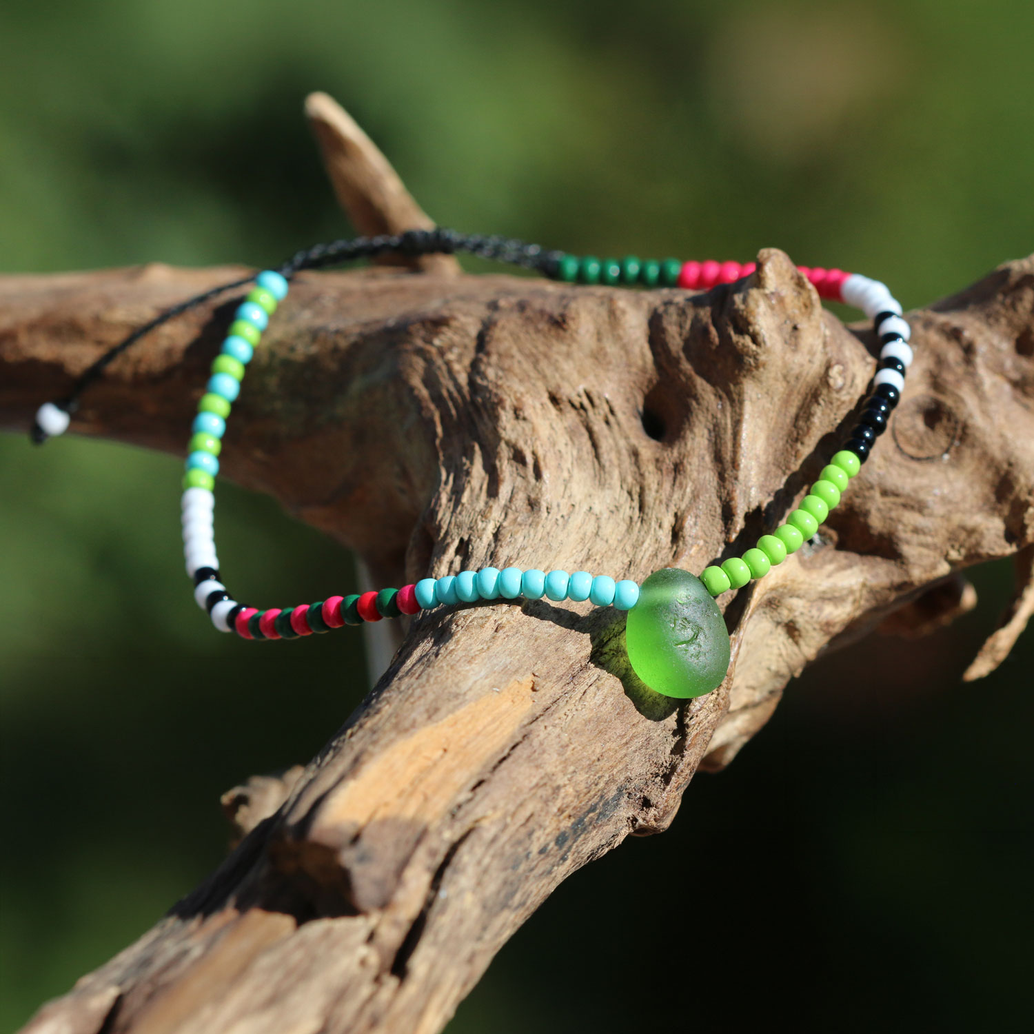 Knallvergnügt – Fußbändchen mit Perle aus echtem Seeglas / Strandscherbe vom Strand Italiens und Rocailles. Die kleinen bunten Glasperlen haben einen Durchmesser von 3 mm. Das Fußbändchen ist in der Größe einstellbar.