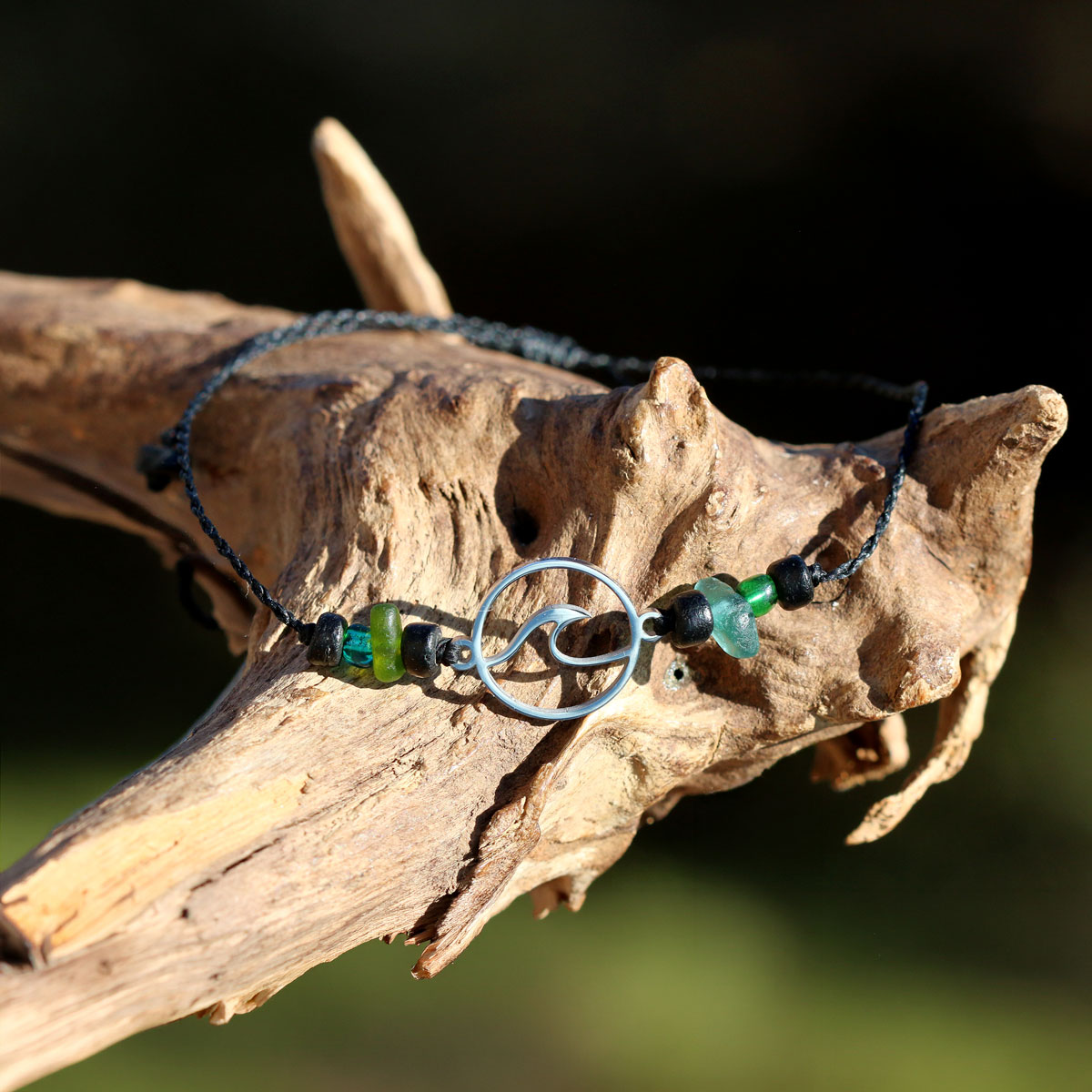 Die perfekte Welle, sehr filigranes Fußbändchen mit Welle aus Edelstahl, 2 kleinen Strandscherben und Perlen aus Kokosnuss und Glas. Die Welle in der Farbe Silber hat einen Durchmesser von ca. 15 mm. Das nautische Band ist von Hand gedreht (Polyester, Linhasita) und hat einen Durchmesser von 1 mm. Es ist in der Größe einstellbar.
