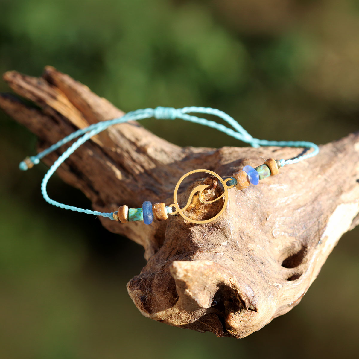 Die perfekte Welle, sehr filigranes Fußbändchen mit Welle aus Edelstahl, 2 kleinen Strandscherben und Perlen aus Kokosnuss, Glas und Metall. Die Welle in der Farbe Gold hat einen Durchmesser von ca. 15 mm. Das nautische Band ist von Hand gedreht (Polyester, Linhasita) und hat einen Durchmesser von 1 mm. Es ist in der Größe einstellbar.