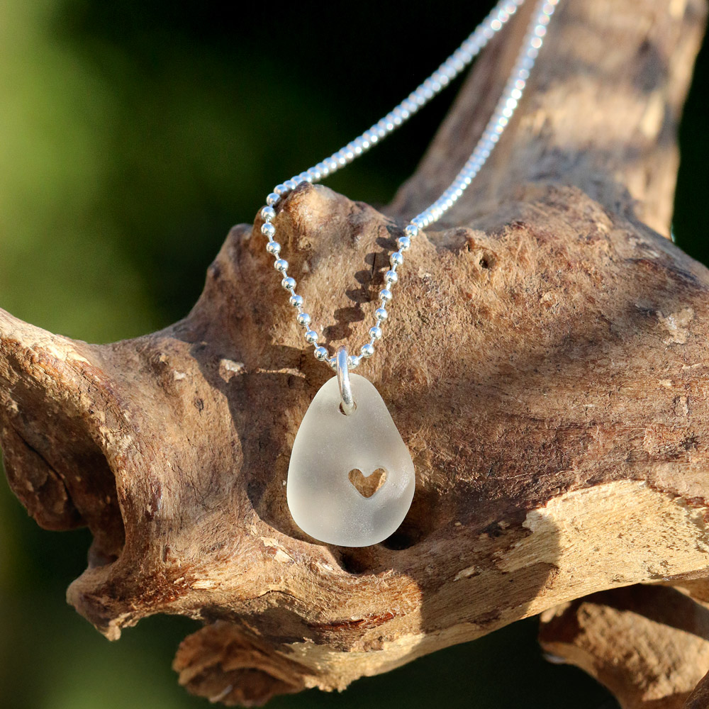 Vom Strand zum Anhänger…die vom Meer polierte weiße Strandscherbe mit von Hand gebohrtem Herz stammt vom Strand Italiens, echtes Meerglas. Die Strandscherbe hat eine Länge von ca. 1,7 cm. Die Kugelkette, ebenfalls aus 925 Sterling Silber, hat eine Länge von 45 cm und eine Stärke von 1,5 mm.