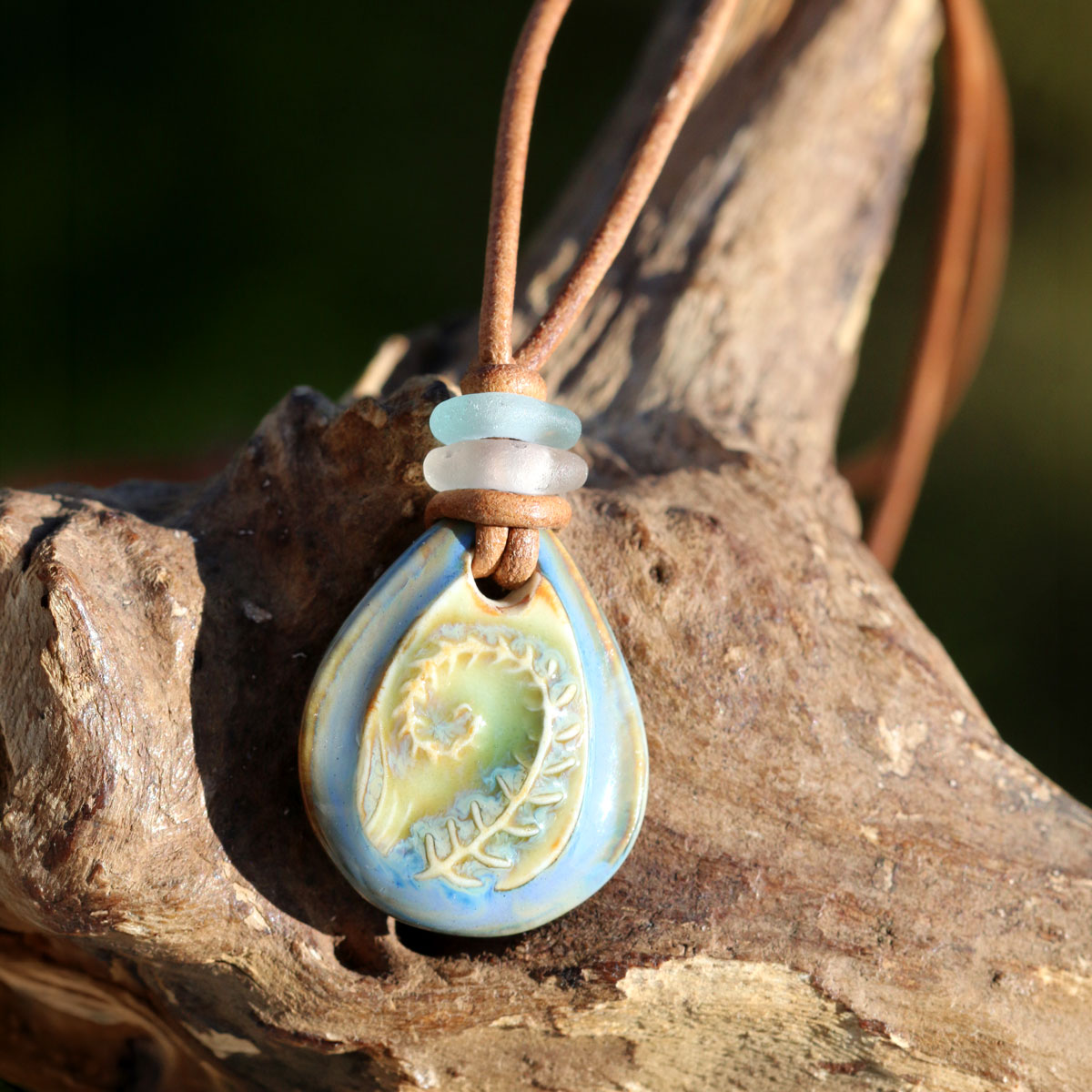 Fernweh… Lederband mit Anhänger Farn aus Keramik und Perlen aus Seeglas / Strandglas. Das Glas wurde am Strand der Türkei in Side gefunden. Das Lederband hat eine Stärke von 2 mm und eine maximale Länge von 80 cm. Die Länge ist mit Schiebeknoten einstellbar. Der Anhänger hat eine Länge von ca. 3,5 cm (inkl. Strandscherben).