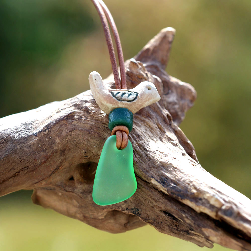 Jeder sollte einen Vogel haben…. Lederband mit Anhänger aus kleinem Keramik-Vogel und Strandscherbe / Seeglas. Die Strandscherbe stammt vom Strand Spaniens und ist ca. 2,7 cm lang, der Anhänger inkl. Vogel ist ca. 5,5 cm lang. Das Lederband hat eine Stärke von 2 mm und eine maximale Länge von ca. 74 cm. Es wird mit Schiebeknoten geschlossen und kann daher auch ganz kurz getragen werden.