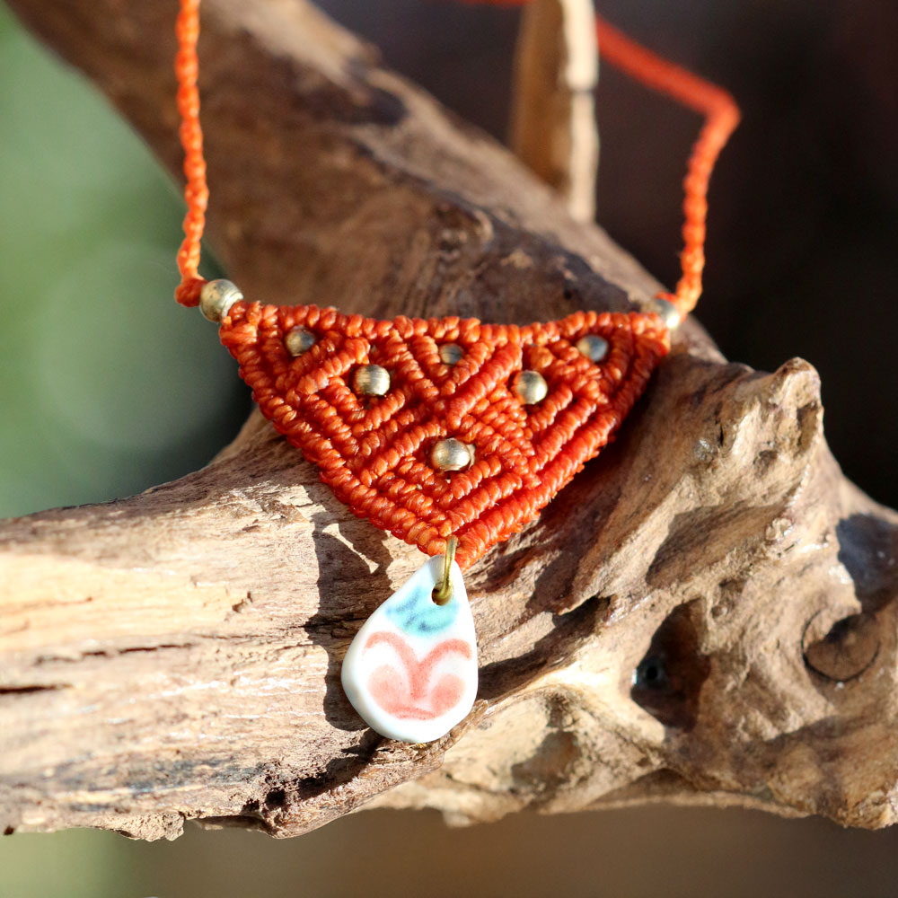 Vom Strand zum Schmuck… Makramee-Halskette mit kleinen Messingperlen und Strandscherbe aus Keramik in Orange. Die Strandscherbe ist ca. 1,6 cm lang. Das geknotete Dreieck hat oben an der breitesten Stelle eine Breite von ca. 4 cm. Das Band (Makrame, Linhasita) ist in der Länge einstellbar. Es hat eine maximale Länge von ca. 73 cm.