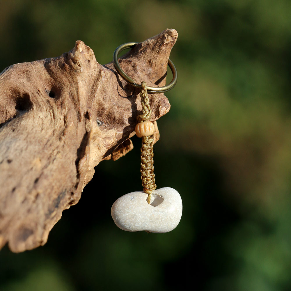 Schlüsselanhänger mit einem natürlich gelochtem Stein, kleiner Perle und Makrameeband in Moosgrün – Hühnergott / Holey Stone. Nach einem sehr alten slawischen Volksglauben schützen Hühnergötter (hag stones, holey stones) vor bösen Geistern. Der Stein ist ca. 2,5 cm x 1,6 cm groß.