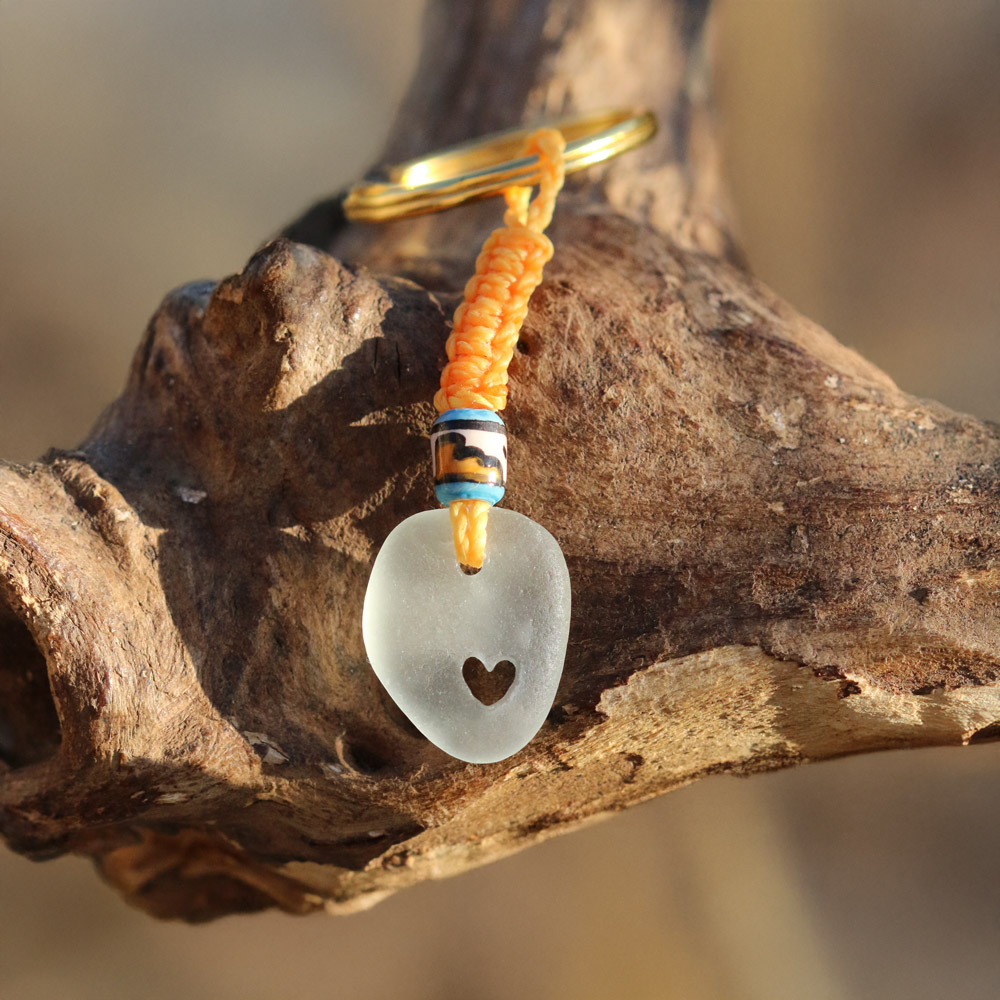 Vom Strand zum Schlüsselanhänger / Taschenanhänger… die Strandscherbe mit von Hand gebohrtem Herz stammt vom Strand Italiens, echtes Seeglas / Meerglas. Die Scherbe hat eine Länge von ca. 1,8 cm – handgemachte Glücksbringer (Scherben bringen Glück).