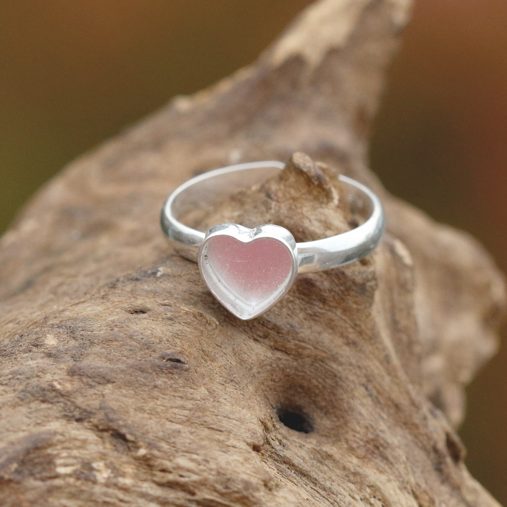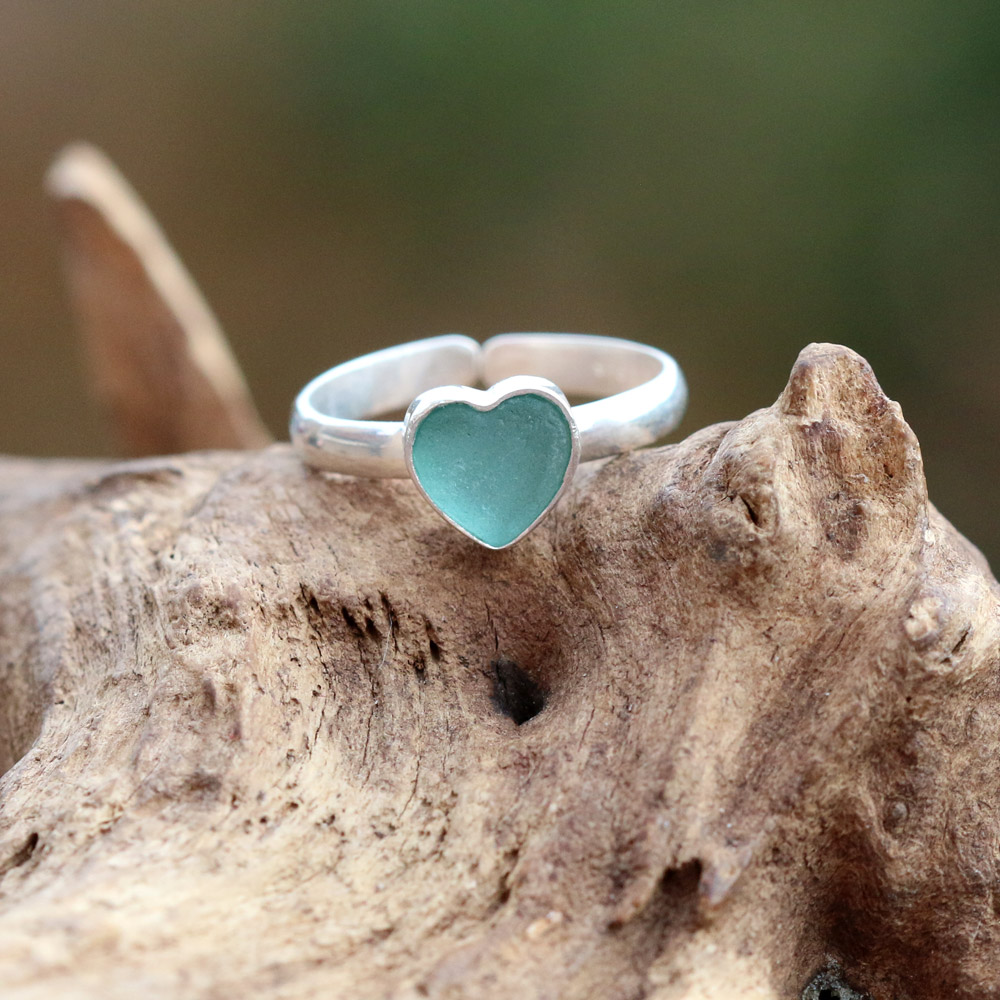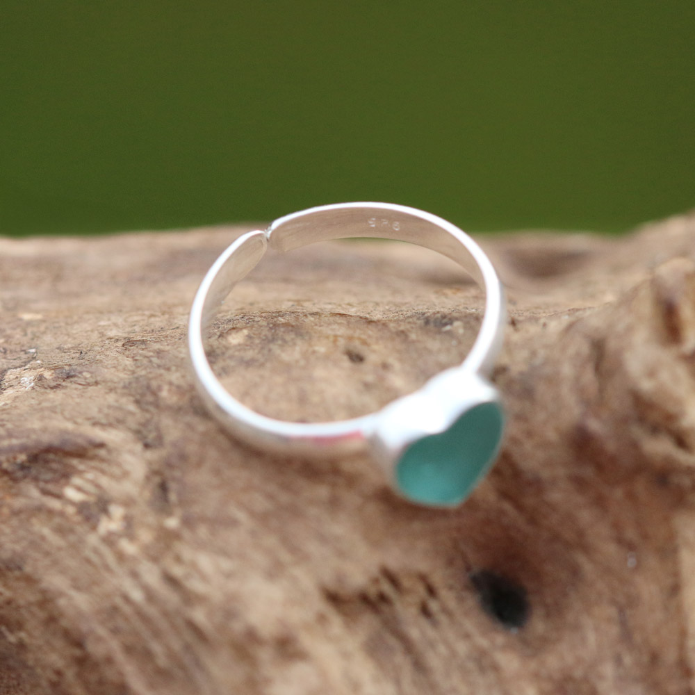 Vom Strand zum Ring…. In der Größe einstellbarer Seeglasring mit Herz – Fassung aus 925 Sterling Silber mit echtem Seeglas / Meerglas in Türkis von der Küste Spaniens. Die Fassung hat einen Durchmesser von 7 mm. Der Ring ist eher für schlankere Finger geeignet.